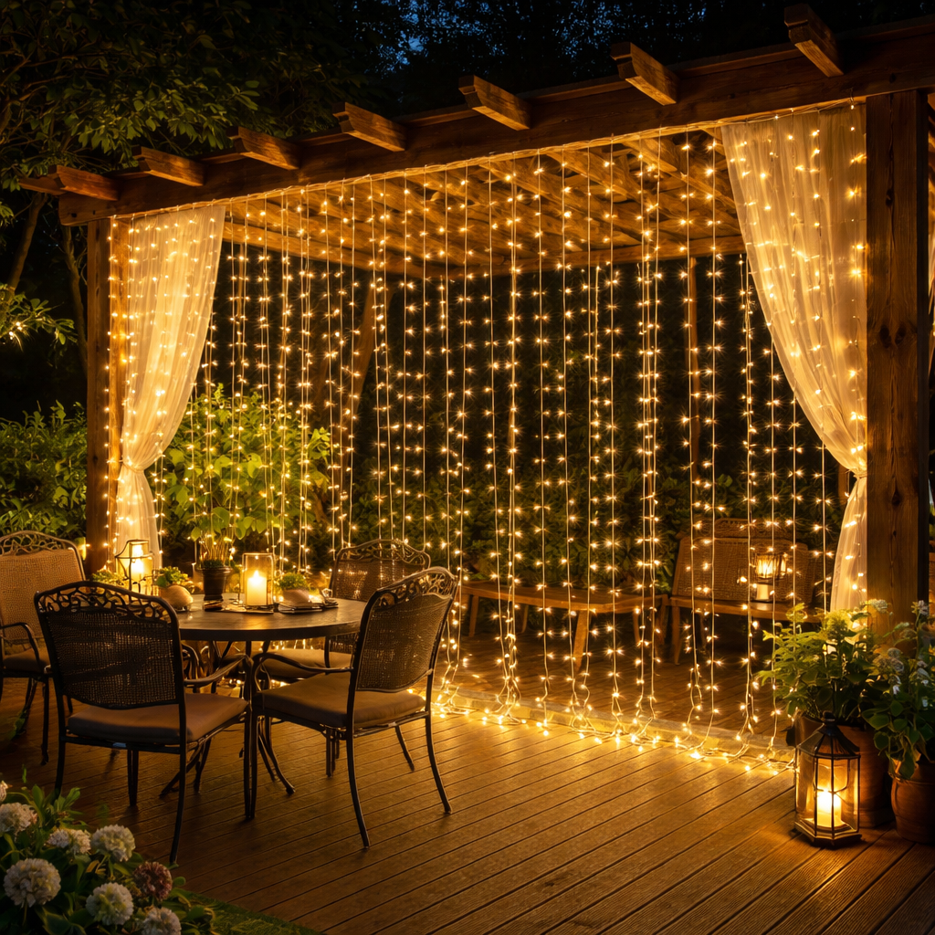 Designed to drape effortlessly through gardens, pergolas, and windows, it creates a warm, inviting atmosphere for evenings outdoors.